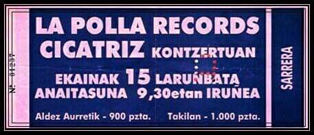 Tras años vividos a toda máquina, multiplicados por unos cuántos cada uno, en 1988, con fecha ya para la grabación de un segundo disco, Zikatriz (según se leía en la entrada) actuaron el 25 de mayo en la Plaza de toros de Estella/Lizarra, siendo este concierto el penúltimo de Natxo antes de un accidente de moto que lo dejó unos años fuera de juego, postrado en silla de ruedas hasta que, fuerza de voluntad y algo más de por medio, ante la incredulidad incluso de la clase médica, se levantó, quedando obligado, eso sí, a valerse de una muletas para andar. Y no solo se levantó, sino que en un increíble salto mortal volvió a poner en pie a Cicatriz, regresando en loor de multitudes con nuevo disco, 4 años, 2 meses y 1 día, y un par de conciertos, tres años después del de Lizarra: uno, el 8 de junio, en Gasteiz, y el otro, el 15, en Pamplona, donde llenaron el pabellón Anaitasuna dando el grupo, en opinión de Natxo, el concierto de su vida. Subidón, tras abrir para ellos La Polla Records. Ah, el grupo de Evaristo, cuántos conciertos protagonizó en este, el pabellón del rock por excelencia, ya propios, ya abriendo para otros en su vuelta (como en este caso) o haciéndolo en su despedida, algo que harían a finales de 1992 a propósito de la de Hertzainak.