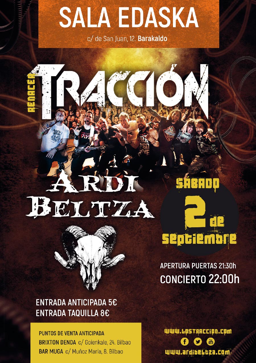Es un placer anunciaros que Tracción, la poderosa banda de Pamplona integrada por Tol, a la voz; Alfonsete, a la guitarra y a los coros; David, al bajo, y Dino, a la batería, presentarán el sábado 2 de septiembre su tercer disco en Barakaldo. La cita será en la sala Edaska, y en ella estarán acompañados por Ardi Beltza. Ya están a la venta las entradas en los siguiente puntos de Bilbao, Brixton denda y bar Muga, al precio de 5 Euros. El precio de las mismas será de 8 si se compran en taquilla.